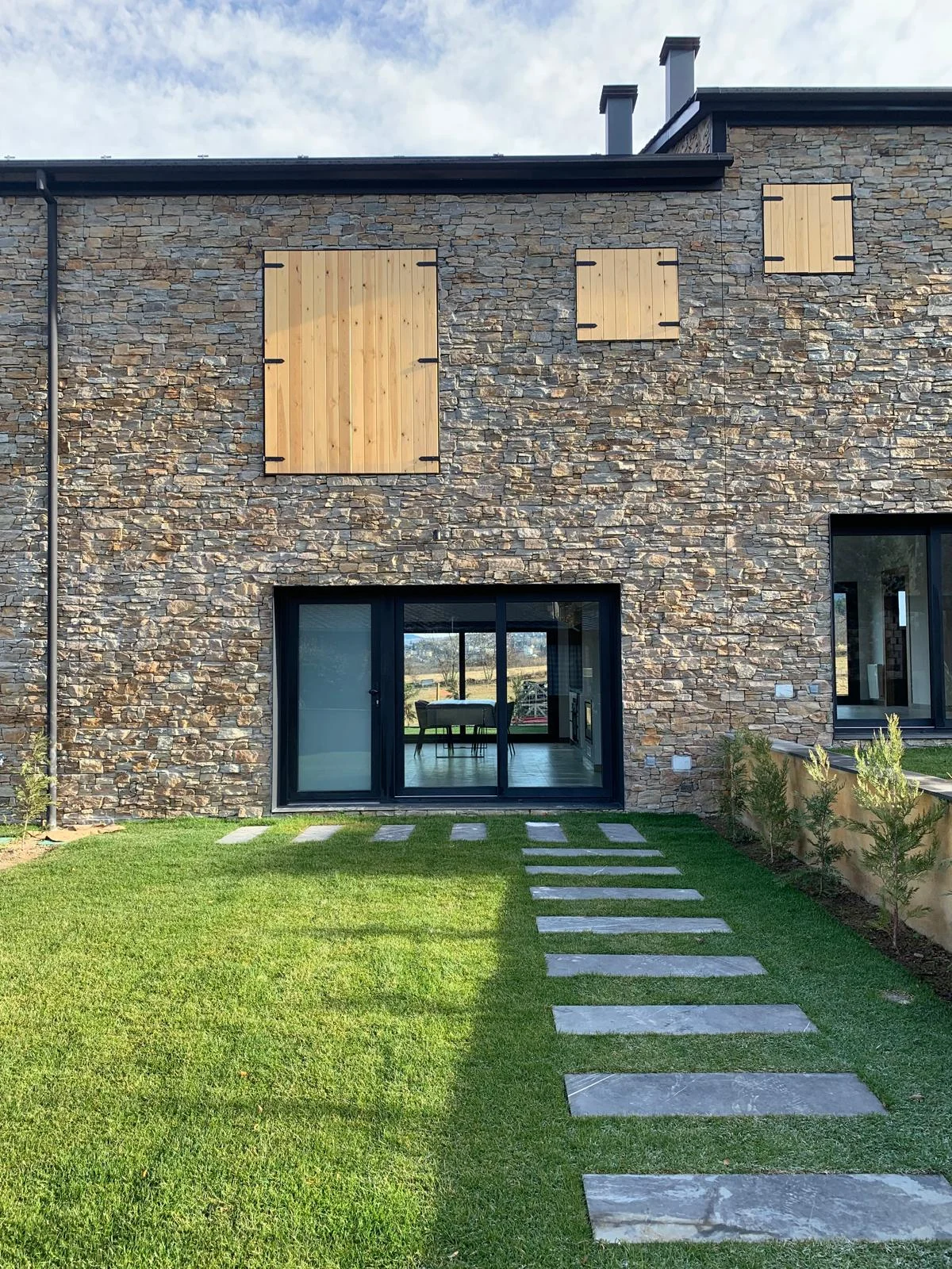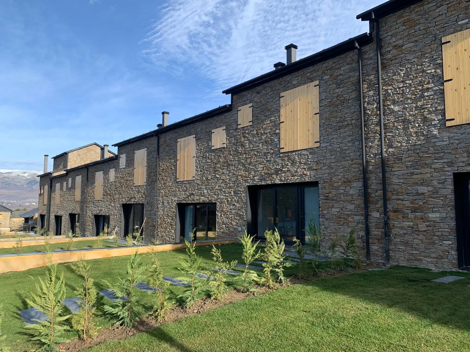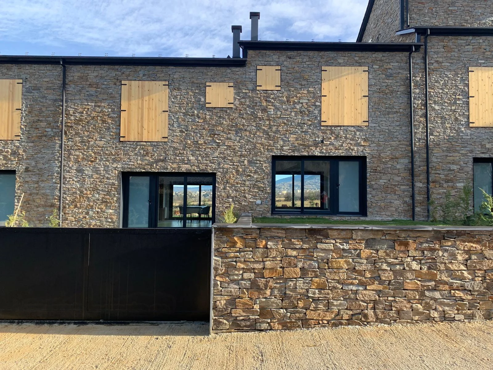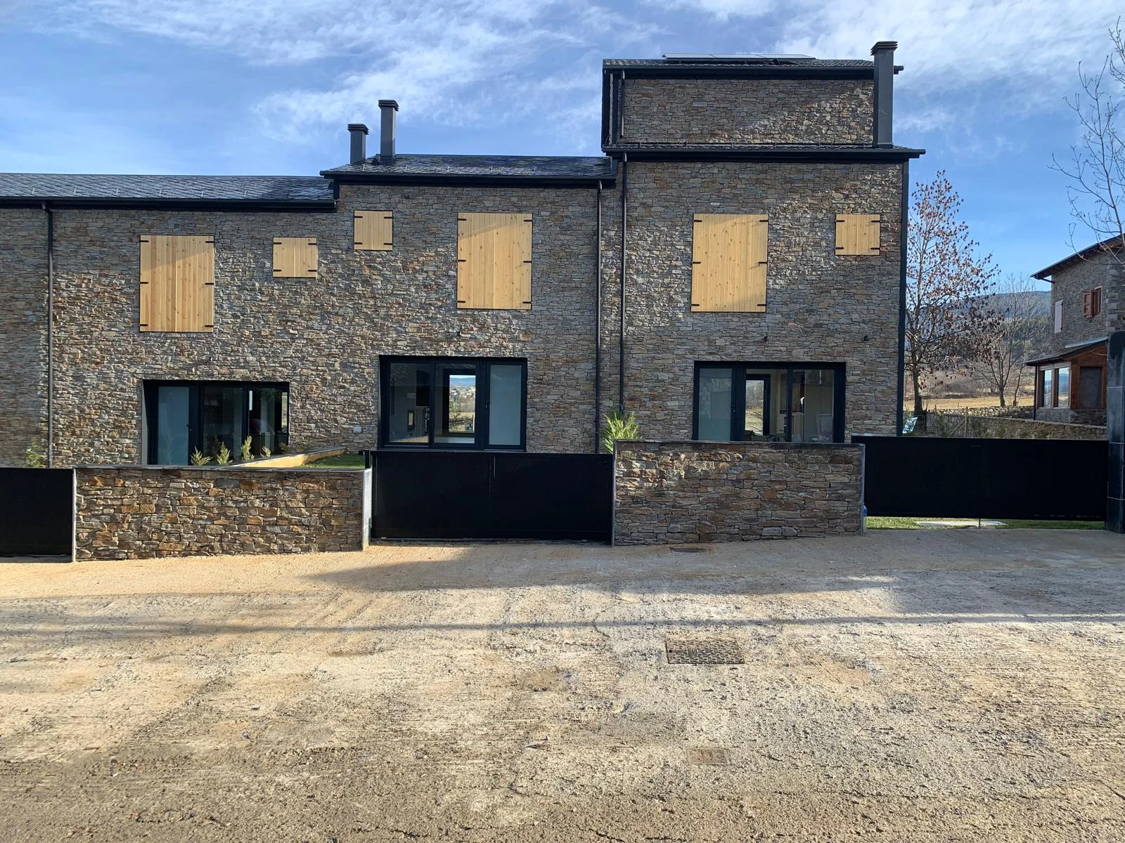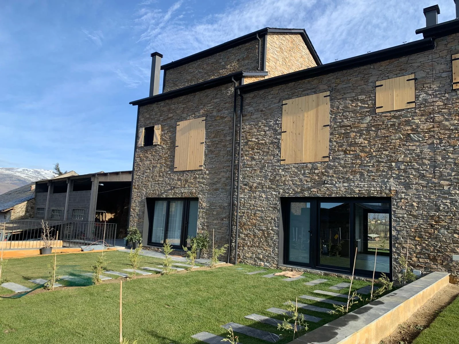 La imagen exterior del conjunto responde al equilibrio entre los elementos tradicionales con fachada de piedra y cubierta de pizarra, con elementos actuales de carpintería y persianas oscuras, creando una estética moderna adaptada a las características del lugar.