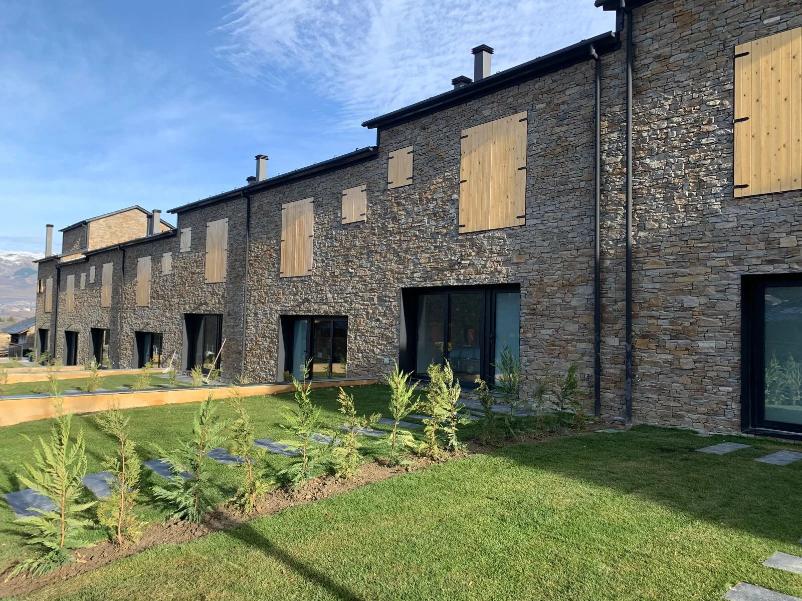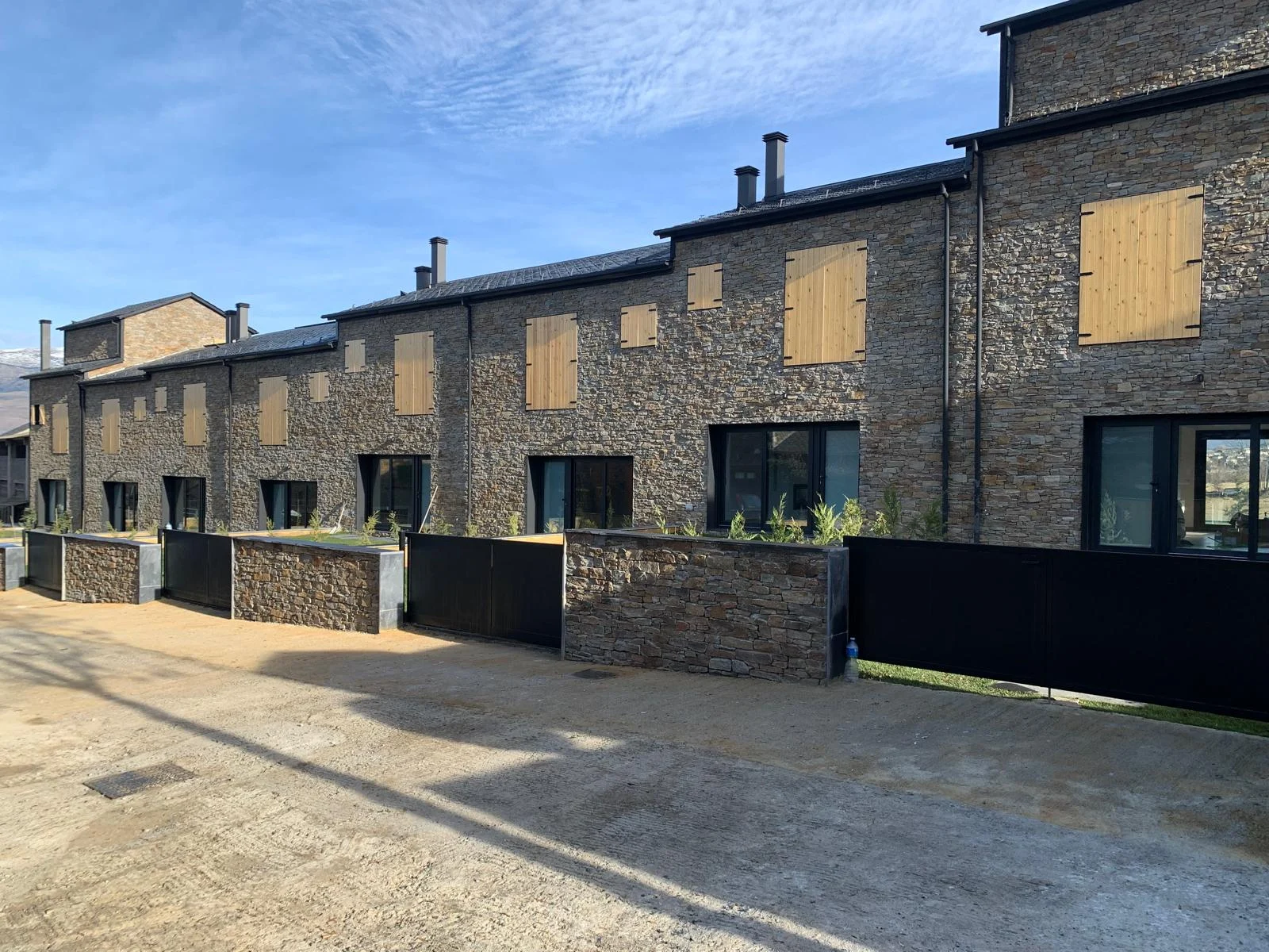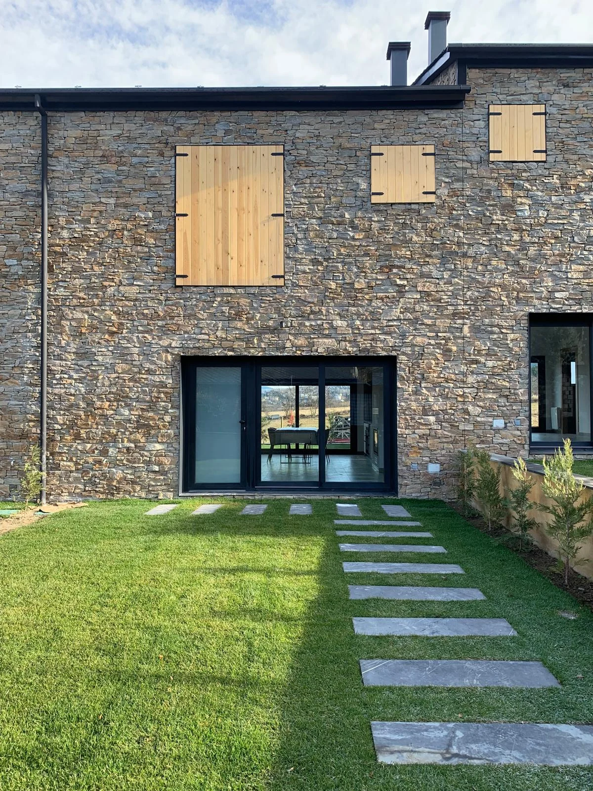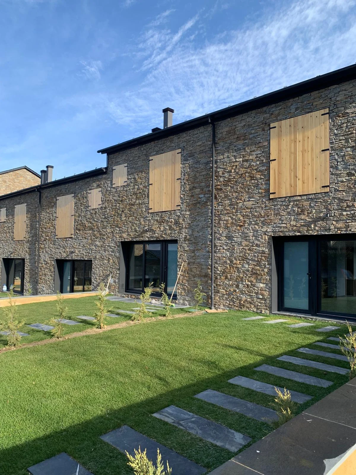 La imagen exterior del conjunto responde al equilibrio entre los elementos tradicionales con fachada de piedra y cubierta de pizarra, con elementos actuales de carpintería y persianas oscuras, creando una estética moderna adaptada a las características del lugar.