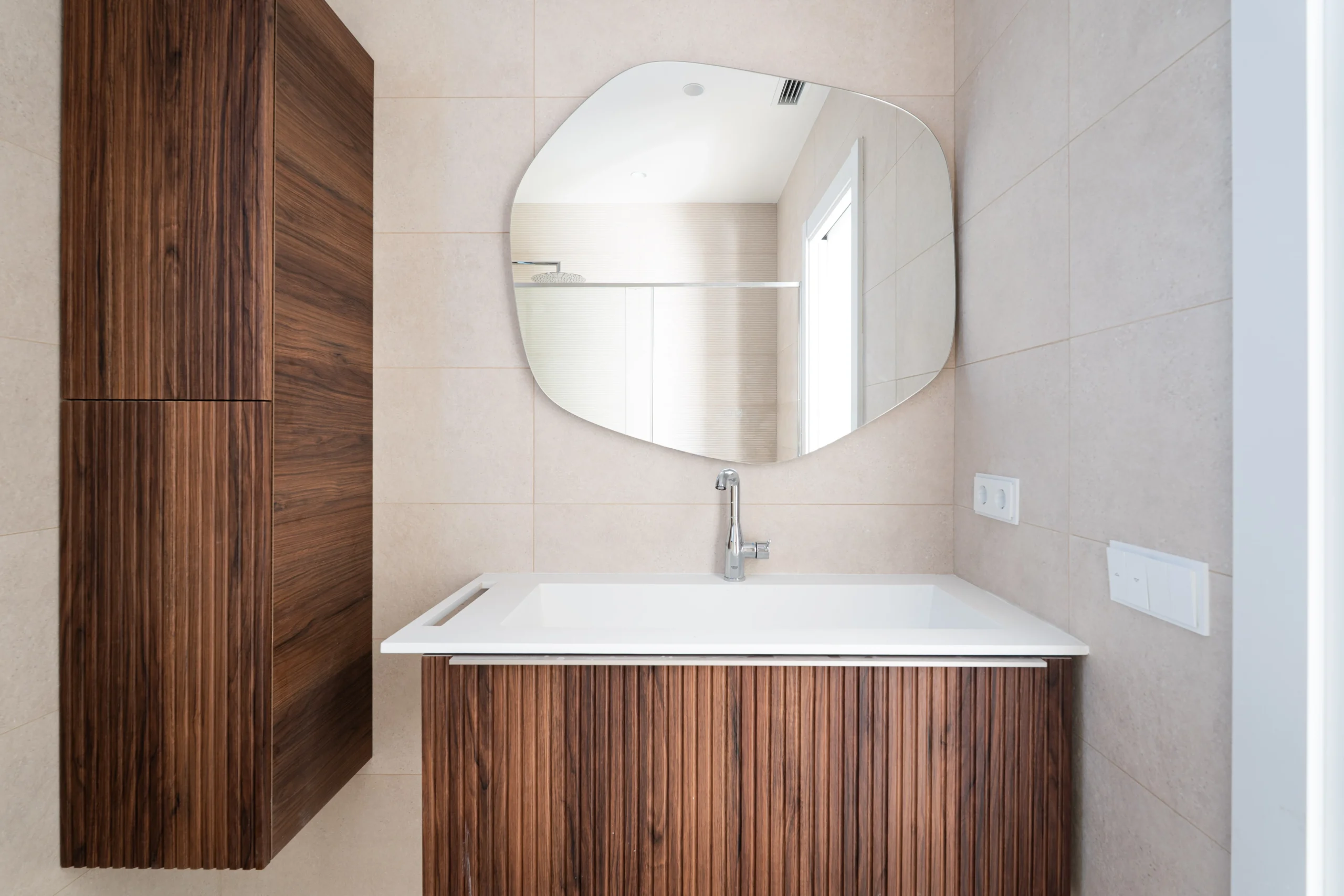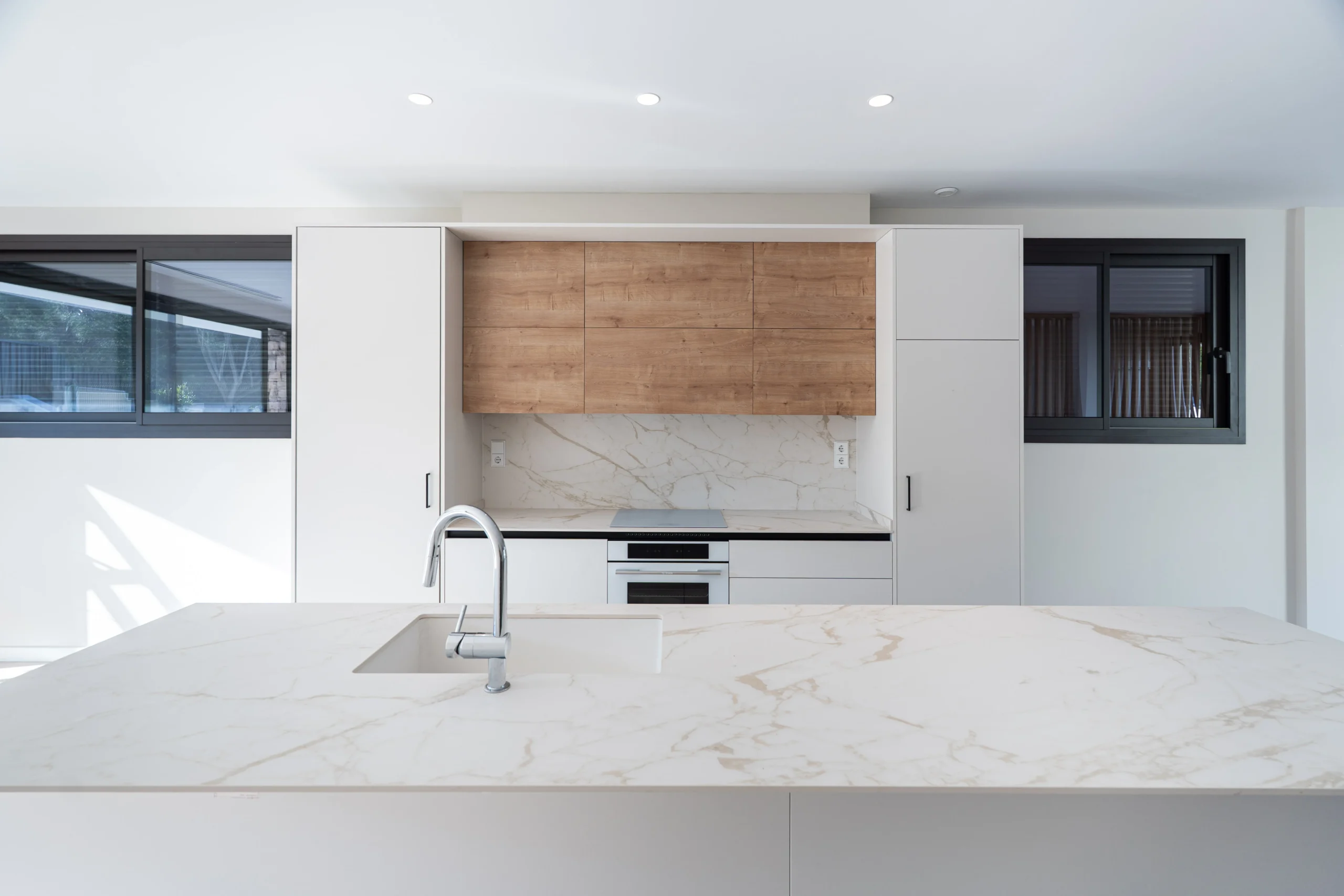 Se ha distribuido cada vivienda en planta baja con un espacio abierto de salón, comedor y cocina en contacto con el espacio exterior de jardín con piscina, y un dormitorio en suite. En planta primera se proyectan tres dormitorios y dos baños.